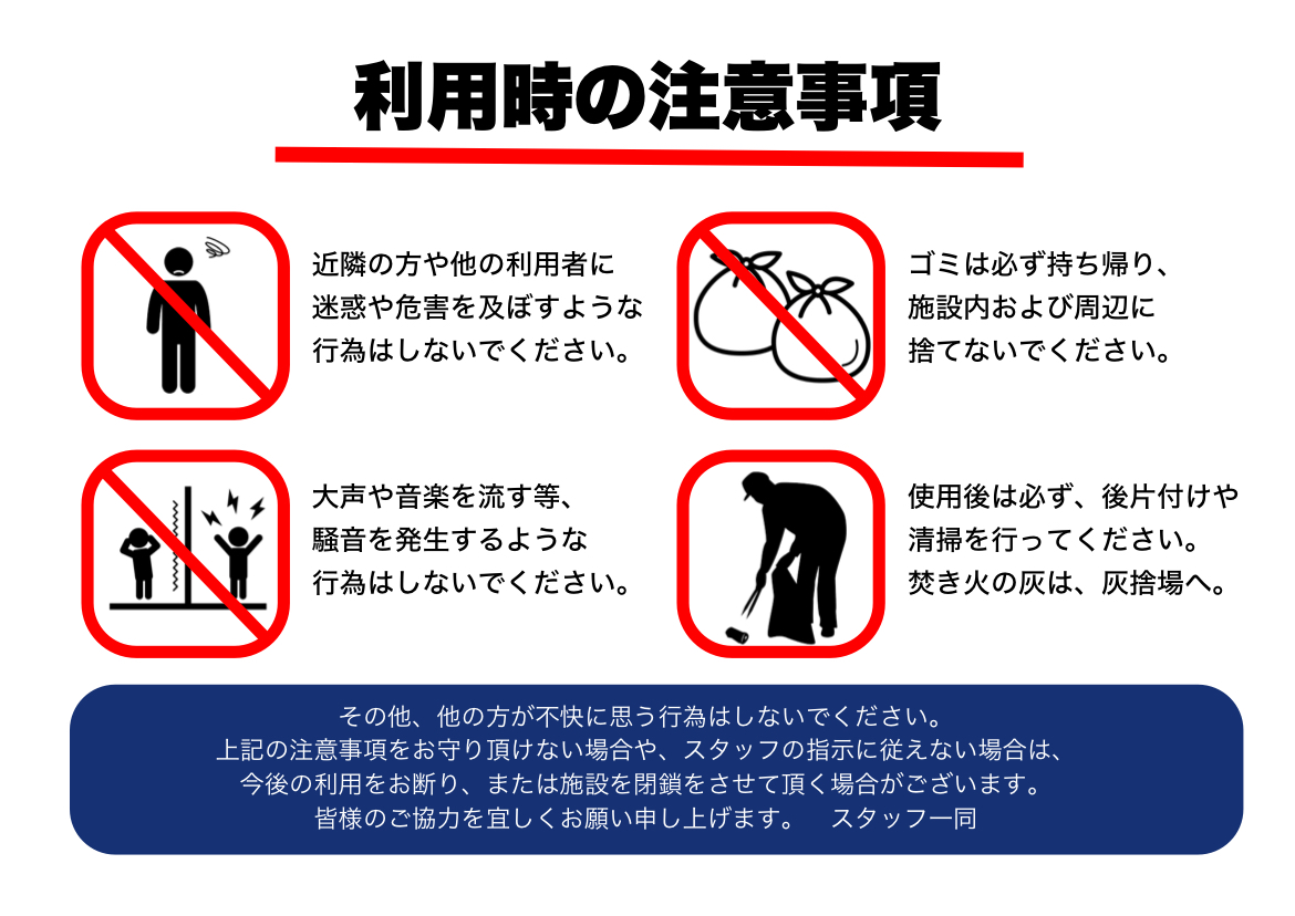 - 当施設はいかなる事故、けが、盗難、トラブル等に関する一切の責任を負いかねます。